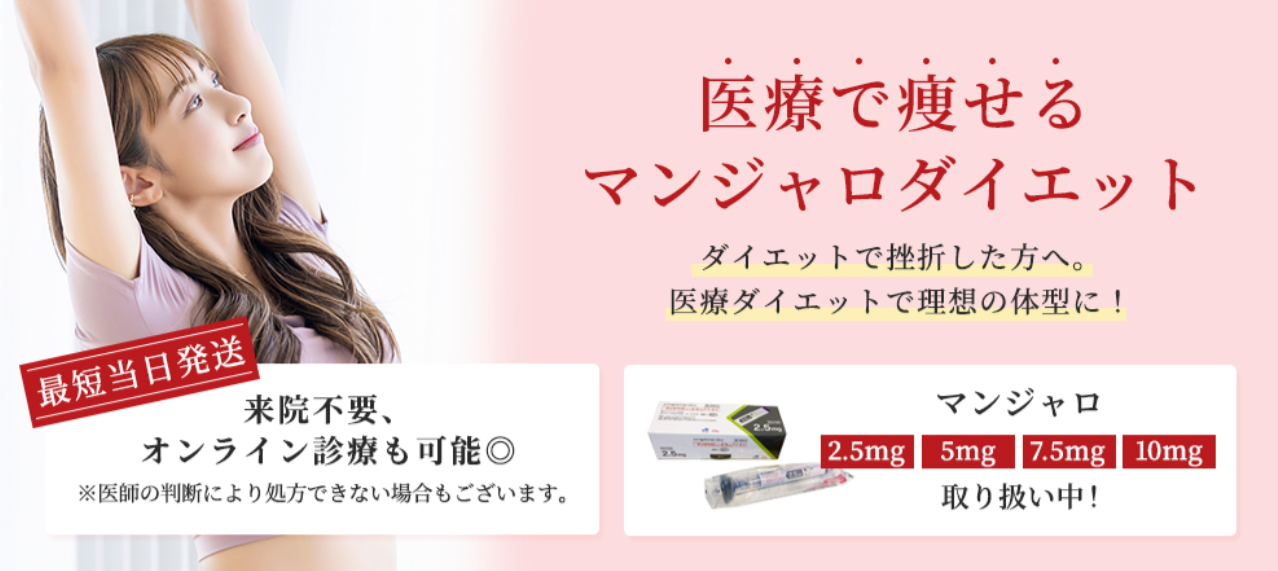 | おすすめポイント | ・発送が早く、医師が管理しているため安心 ・マンジャロ2.5mgだけじゃなく、5mg、7.5mgも安い | ・24時間診察中。 ・有名サービスが運営。 ・マンジャロに加えてさらに体重を減らすメニューも豊富なため、本気で痩せたい方におすすめ。 | ・続けやすい料金設定。 ・女性専用なので女性に寄り添った診察を実施。 |